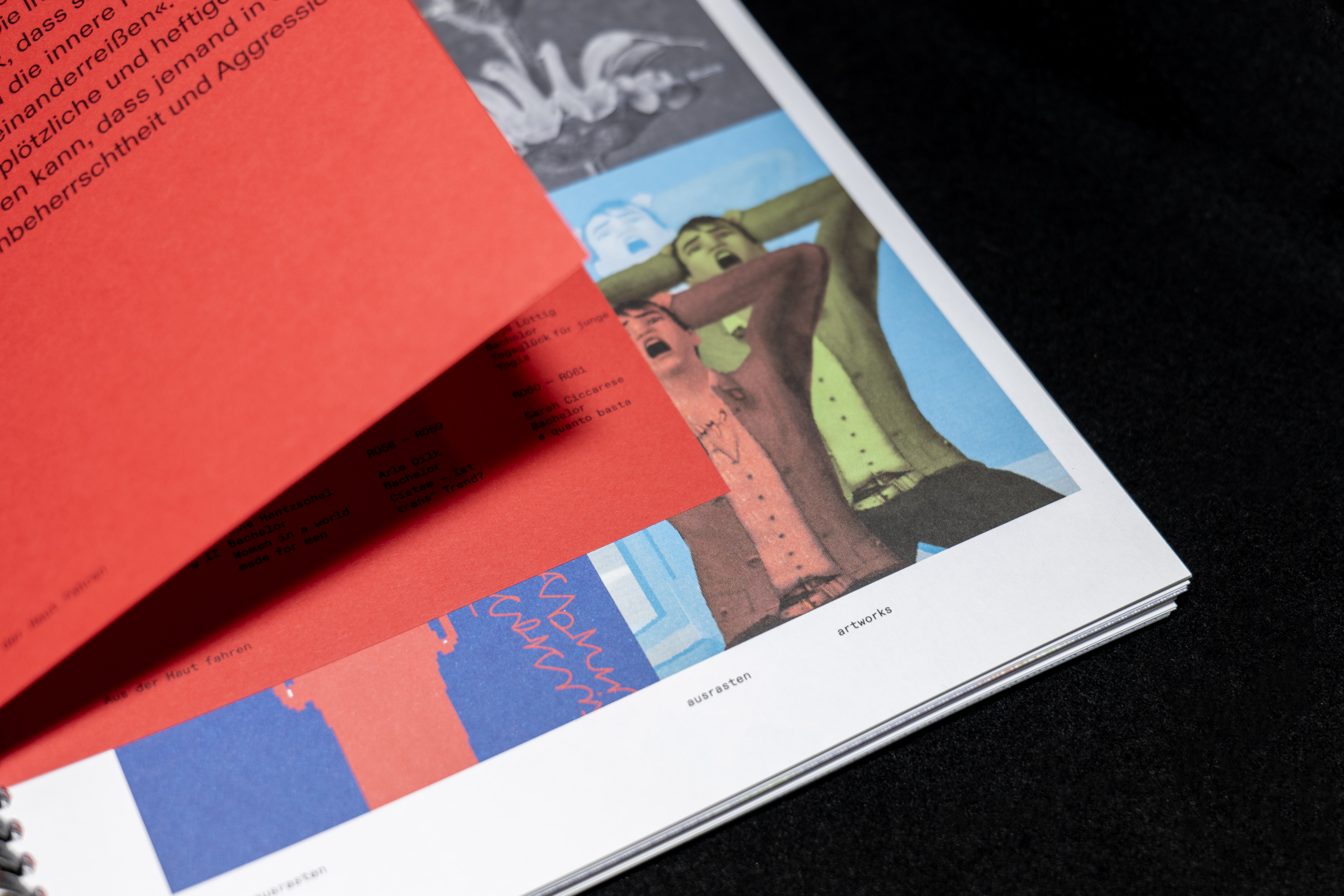 The magazine’s standout feature is affectionately called the “chunky plastic spiral,” along with colorful chapter dividers that segment the content. The cover begins in symbolic solid black, transitions to vibrant colors inside, and concludes with a white back cover. As part of the launch event, several covers were spray-painted with red, blue, and green paint, forming a collective artwork. Throughout the rest of the exhibition, visitors were invited to take creative control, customizing their own copies as they pleased.